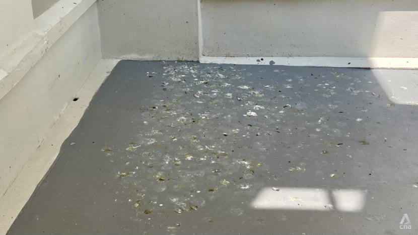 When CNA visited the block on Tuesday (Jul 23), several areas on the ground floor as well as the facade of the Housing and Development Board (HDB) block had been splattered with bird droppings.