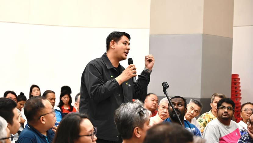 A platform worker speaks during an engagement session with National Trades Union Congress Secretary-General Ng Chee Meng at Fernvale Community Club on Aug 26, 2025. (Photo: CNA/Tan Grace)