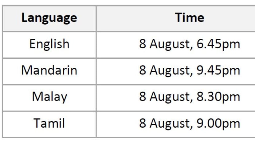 The English broadcast will be on news channel CNA while the Mandarin broadcast will be on Channel 8 and Capital 958 radio station.