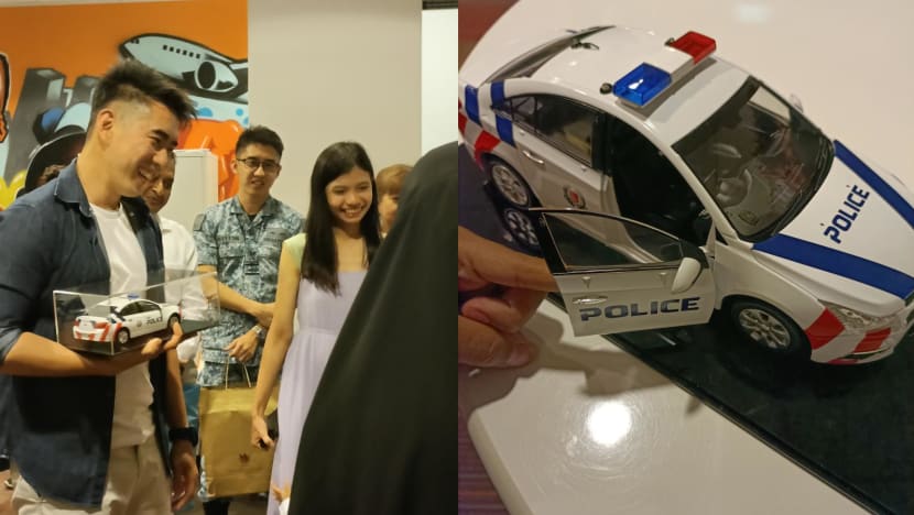 He brought along a toy model of a Singapore Police Force car for the boy, while the boy’s parents gave him a thank-you card and a custom-made cake of a police officer uniform complete with “handcuffs”.