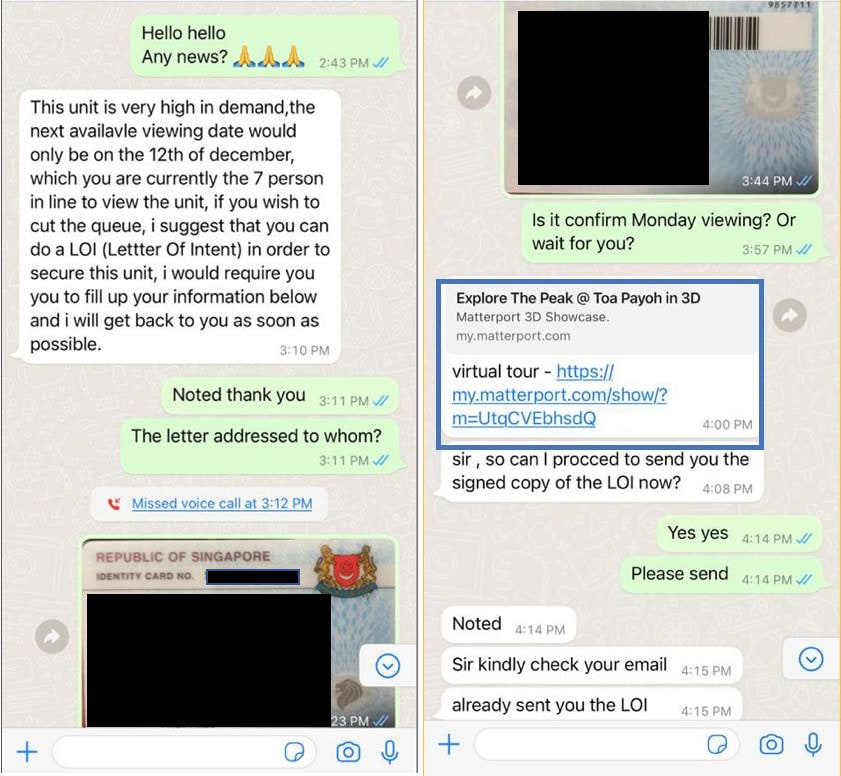 They would generally interact with the scammers through WhatsApp using the contact numbers in the rental listing. During their exchange, the scammers would pretend to be a property agent registered with the Council for Estate Agencies (CEA).