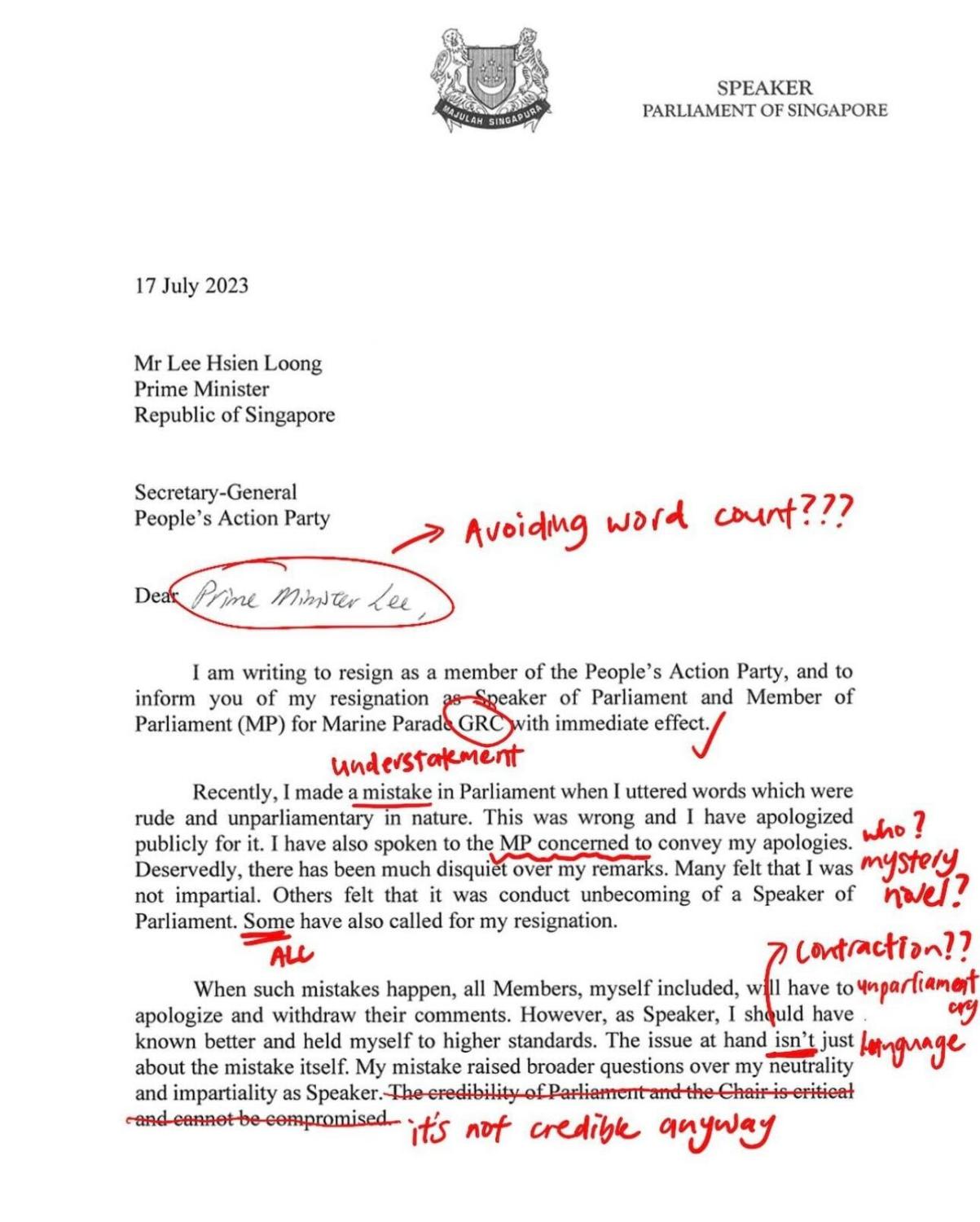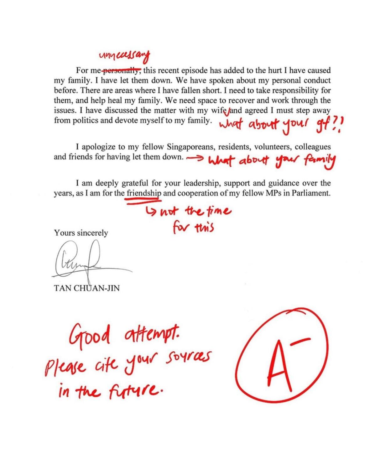 Former Speaker of Parliament Mr Tan Chuan-Jin's resignation letter graded by Instagram page, The Mockingbird.