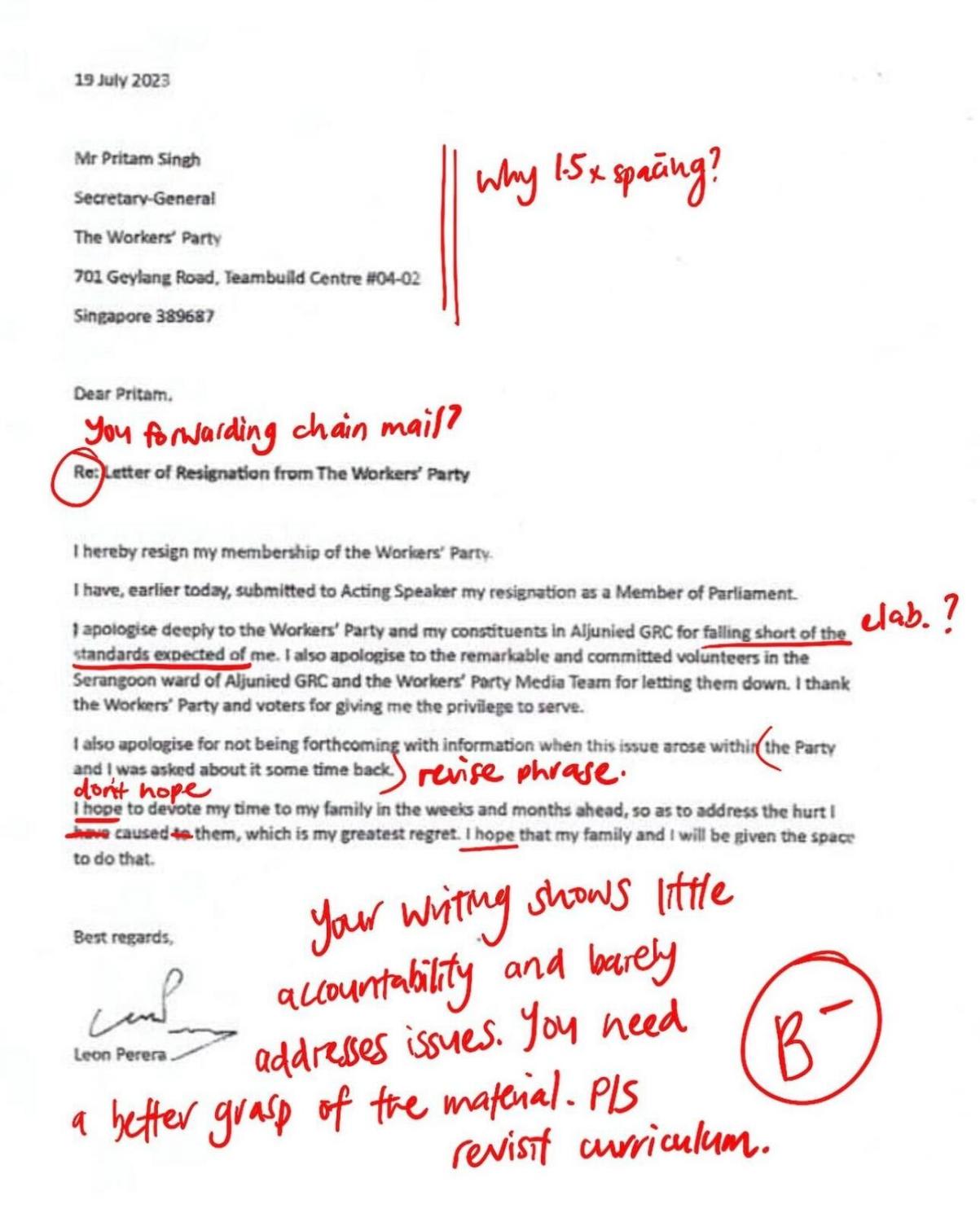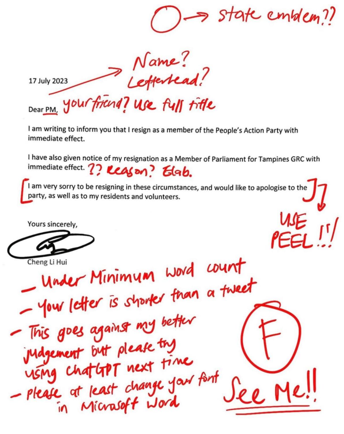 Taking it to the next level, Instagram account The Mockingbird — which calls itself "Singapore's most reliable satire news source" — "marked" and graded the resignation letters and posted them on Wednesday.