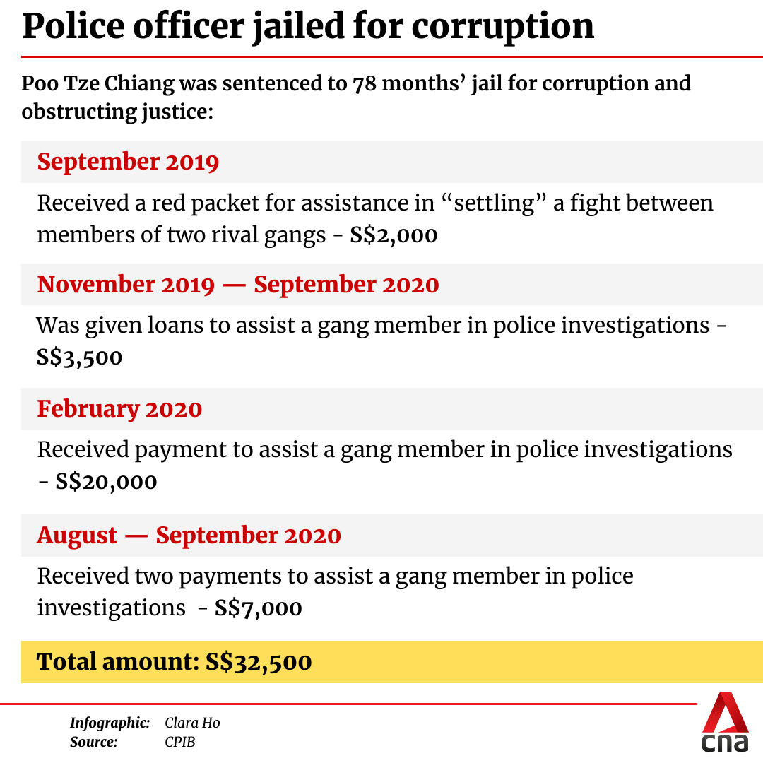 Poo was found to have corruptly accepted or obtained gratifications in the form of cash and loans amounting to S$32,500 from Wang Huate and Cordell Chan Yuen Kwang, said the Corrupt Practices Investigation Bureau (CPIB) on Friday. It added that Poo had shielded the duo from police action on three occasions.