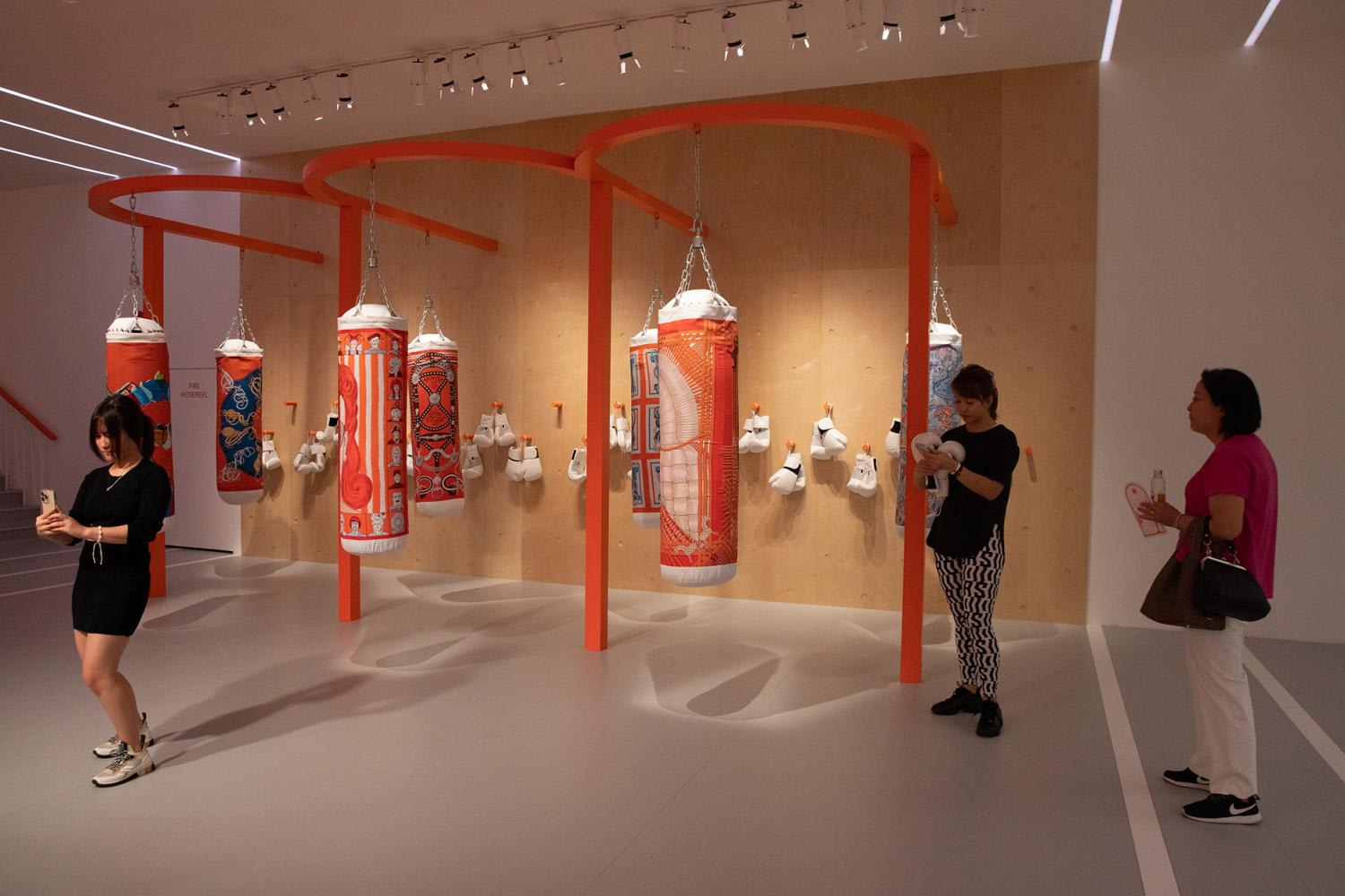 Each punching bag is adorned with a Hermes scarf design. One bag had a print of an elaborate doodle showing a woman's face, and I have to admit that jabbing her right between her eyebrows felt satisfying.