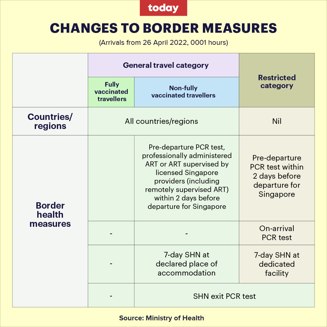 The entry requirements for travellers who are aged 13 and above and not fully vaccinated remain unchanged. This means that they still have to take a pre-departure test within two days before leaving for Singapore, undergo a seven-day stay-home order and take a polymerase chain reaction (PCR) test at the end of the isolation period.