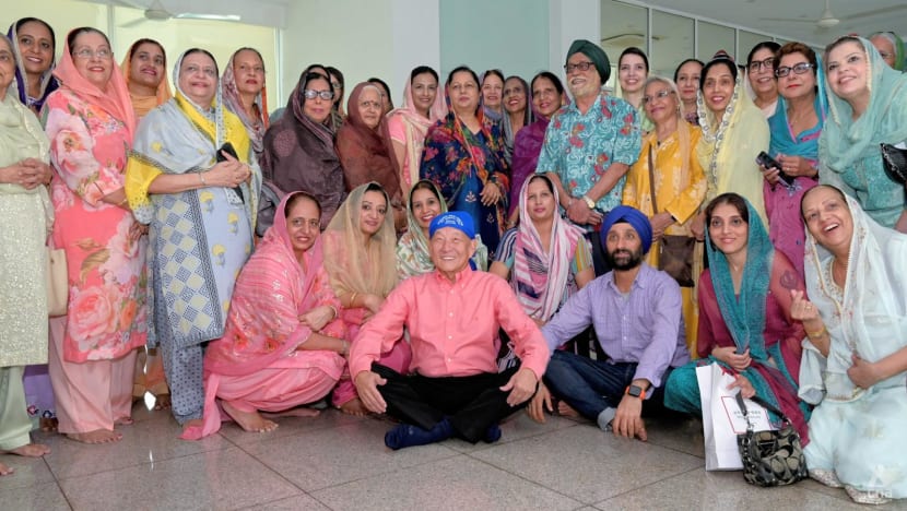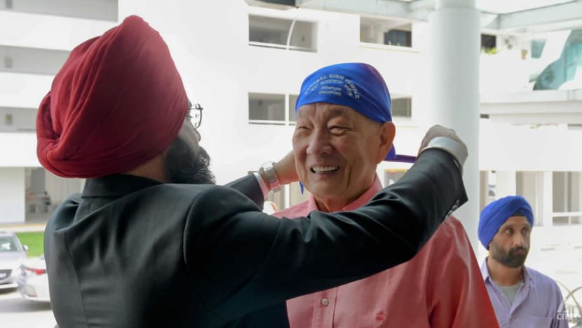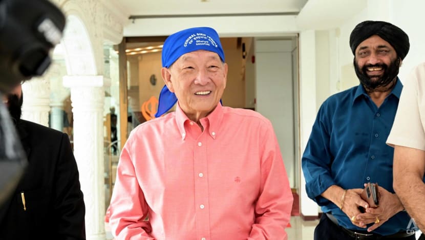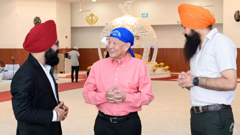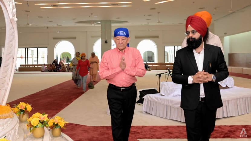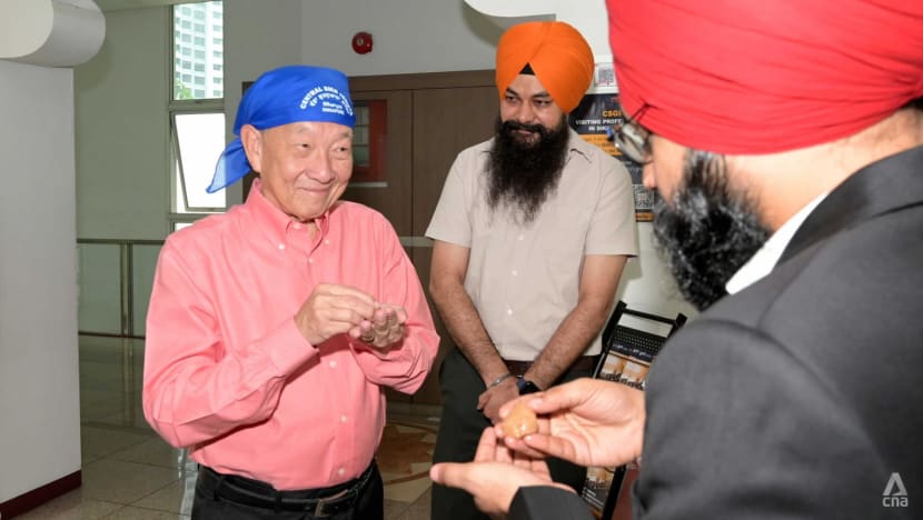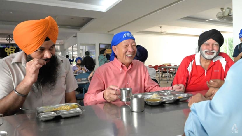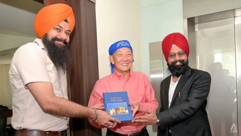 Ng Kok Song is guided around the Central Sikh Temple by Sikhi lecturer Satvinder Singh (left) and temple manager Rajinder Singh (right) on Jul 23, 2023. (Photo: CNA/Try Sutrisno Foo)