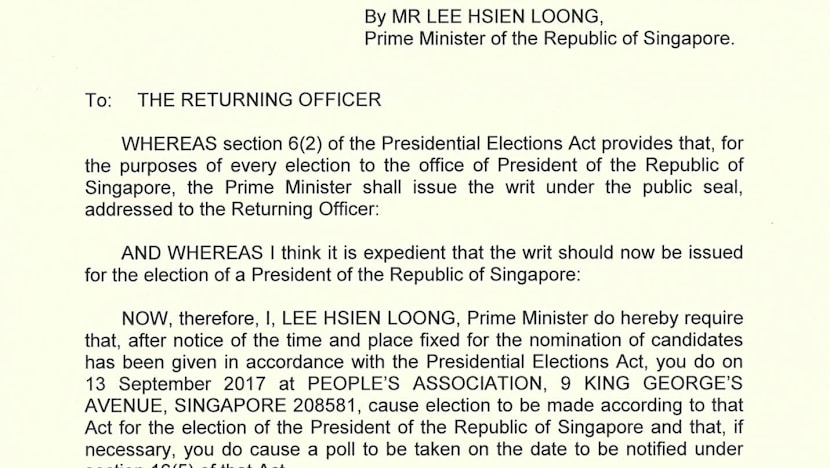 (Click to enlarge) The Writ of Election for the Presidential Election 2017 issued by Prime Minister Lee Hsien Loong. Nomination Day will be on Sept 13, while polling day — if more than one candidate stands nominated — is on Sept 23. Image: Facebook screencap via Lee Hsien Loong