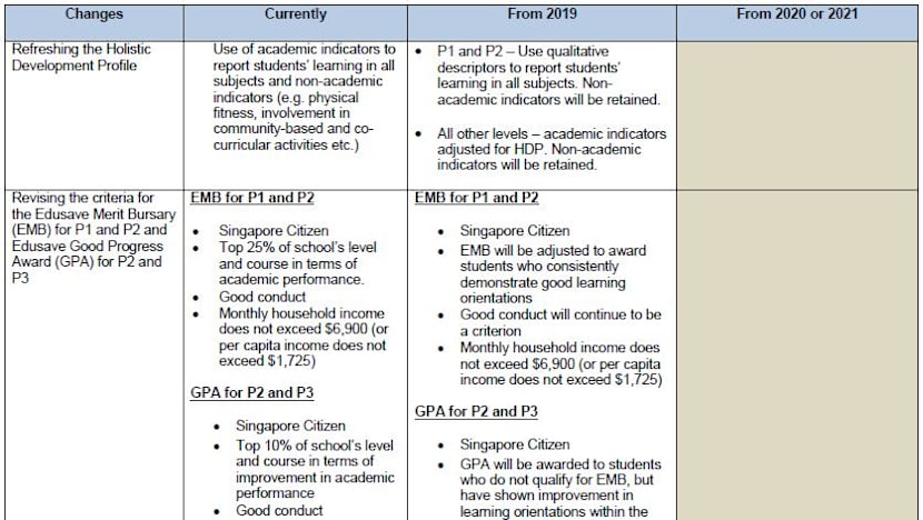 With the changes to school-based assessments, the ministry will also adjust the academic criteria for awarding the Edusave Merit Bursary to Pri 1 and Pri 2 students as well as the Edusave Good Progress Award to Pri 2 and Pri 3 students.