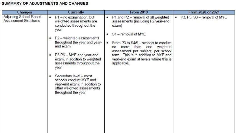 Mid-year examinations for students in Pri 3, Pri 5, Secondary 1 and Sec 3 will also be removed in phases from 2019 while all students from Pri 3 to Sec 4 or Sec 5 will not have more than one weighted assessment per subject per school term.