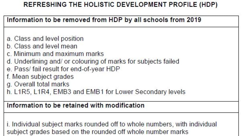 Changing the look of report books is meant to "encourage a move away from an over-emphasis on examination results and unhealthy competition, and instead, focus on developing each student according to his or her abilities", said MOE.