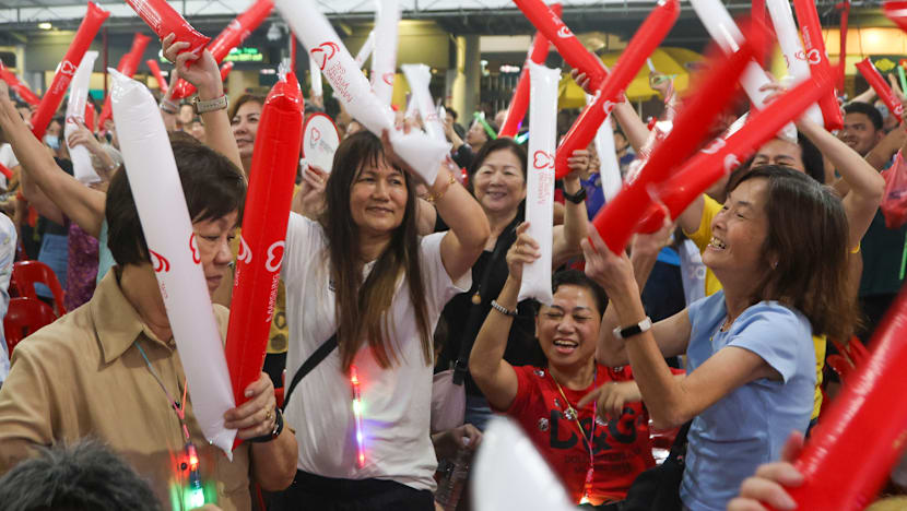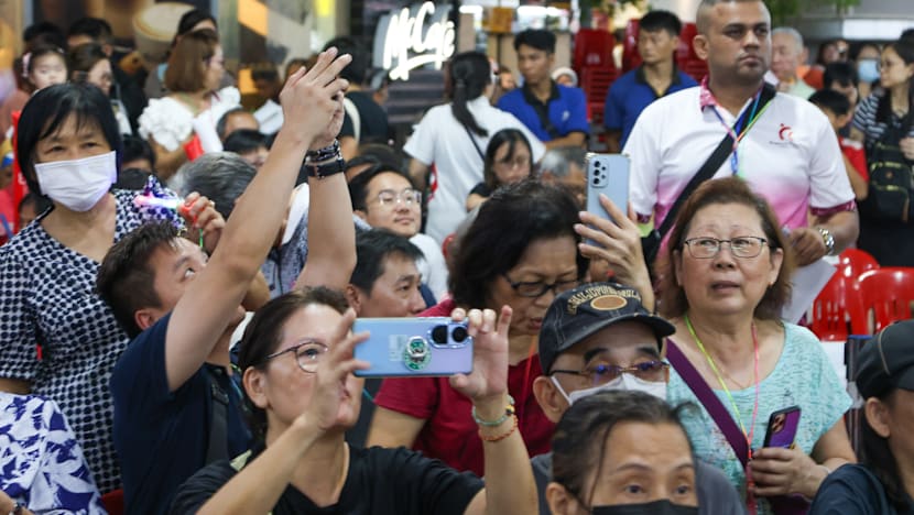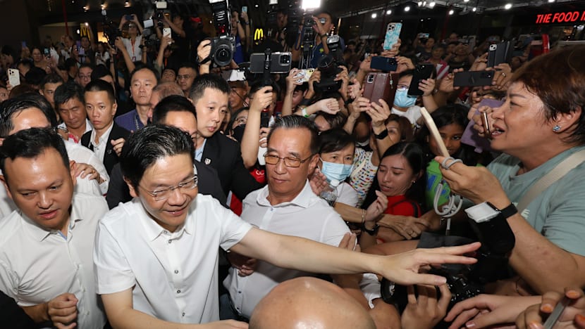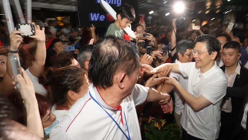 A jubilant crowd of residents greeting and shaking hands with Prime Minister Lawrence Wong at a viewing party in Yew Tee on May 15, 2024.