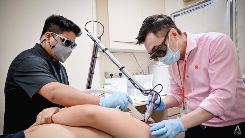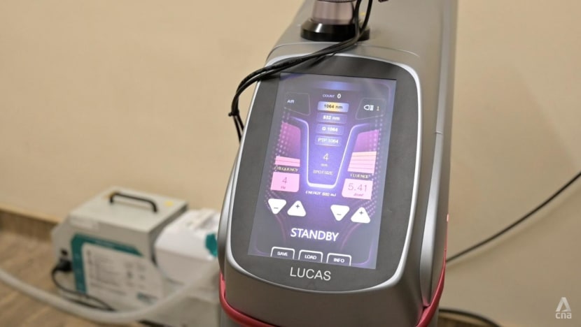 A few doors down past the faded walls, in a room marked for tattoo removal with warnings about laser radiation, Dr Tam familiarised himself with a new S$65,000 laser machine that the SPS had rented to replace an age-worn predecessor.