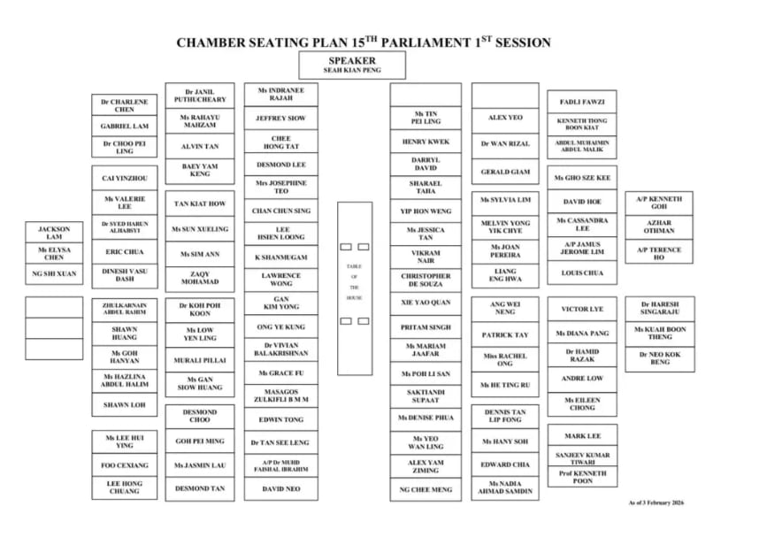 Mr Singh was moved two seats down in the first row, according to a seating plan uploaded on the Singapore parliament website on Tuesday (Feb 3), with Deputy Speaker of Parliament Christopher de Souza taking his previous seat.