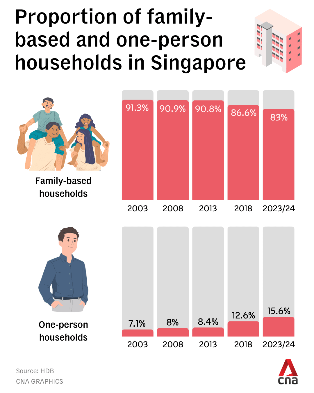 The share of one-person homes rose to 15.6 per cent in 2023/2024, up from 12.6 per cent in 2018 and 7.1 per cent in 2003, according to the Housing and Development Board's (HDB) sample household survey released on Thursday (Nov 27).