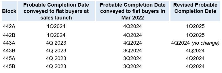 The five blocks have a total of 991 units, while Block 443A, whose competition date would not be expected to be affected, has 188 units.