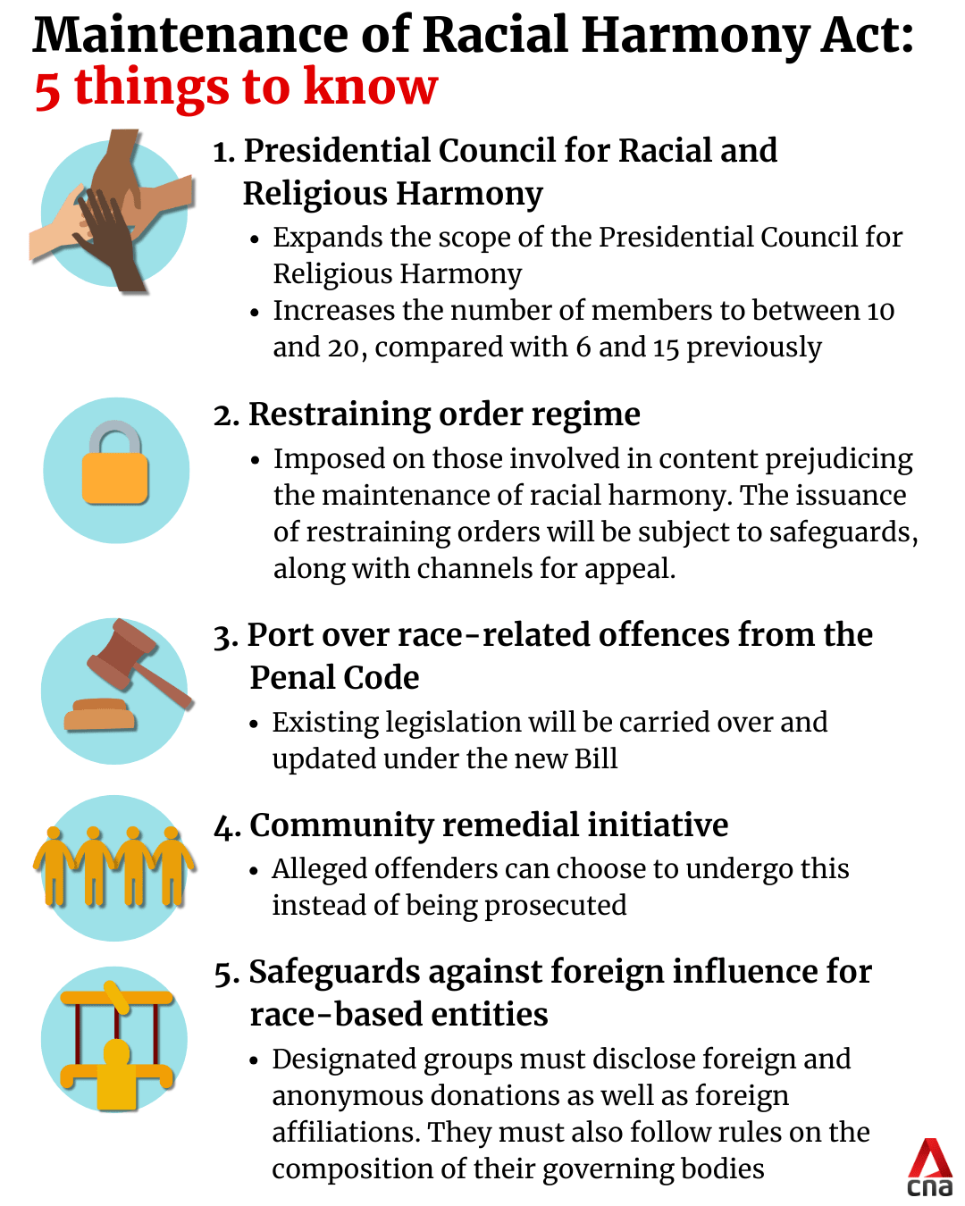 Under the new Act, the Minister for Home Affairs will be able to issue restraining orders against people involved in the communication, production or distribution of content that prejudices the maintenance of racial harmony in Singapore.