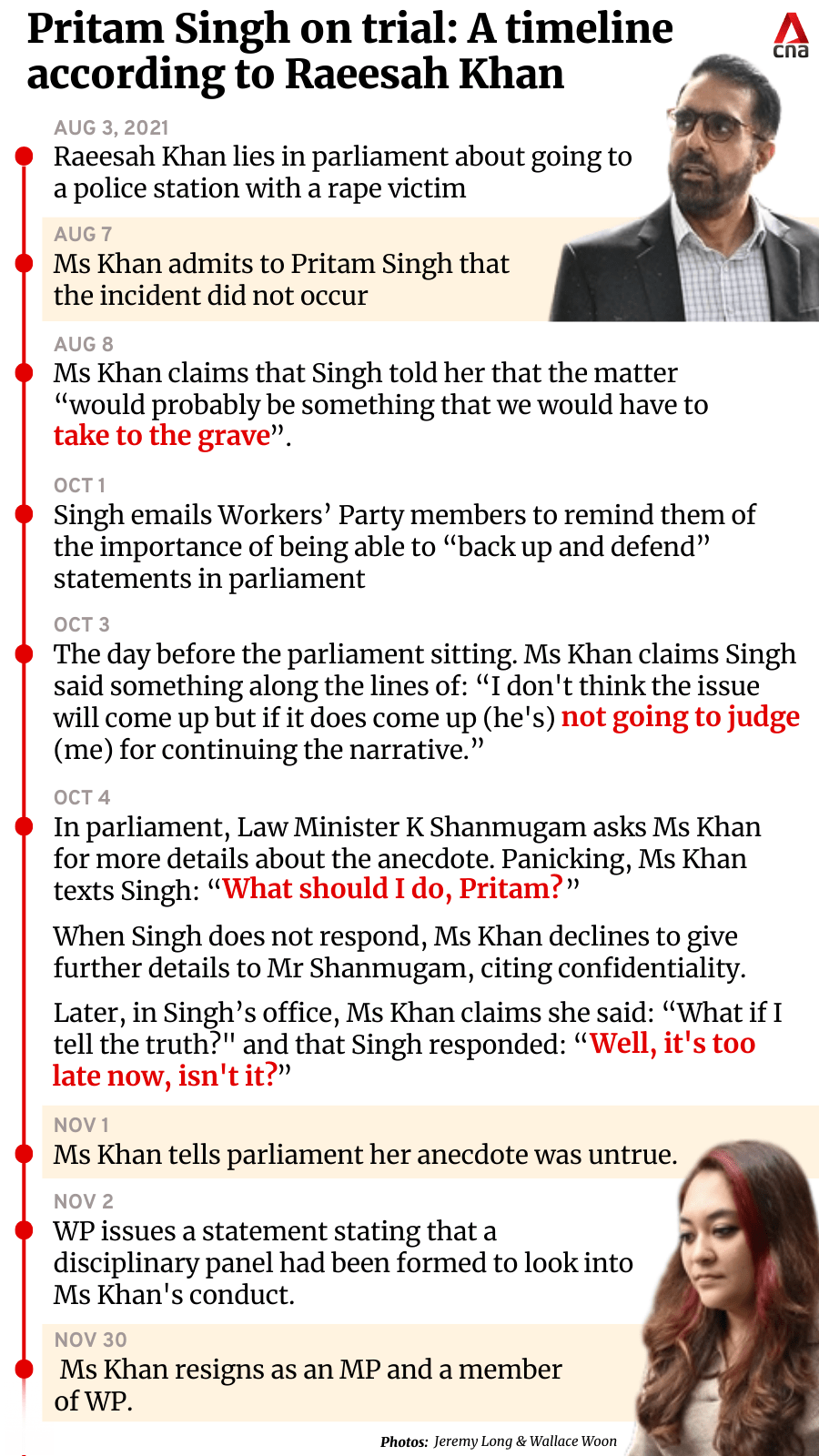 SINGAPORE: On Wednesday (Oct 16), the third day of Workers' Party (WP) chief Pritam Singh's trial for lying to parliament, his lawyer challenged former party member Raeesah Khan, suggesting that she did not require Singh's directive to tell the truth.