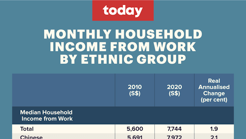 SINGAPORE — The median monthly income from work for households in Singapore rose from S$5,600 in 2010 to S$7,744 in 2020, which is a 1.9 per cent increase yearly after adjusting for inflation — a rate slightly higher than the previous decade.