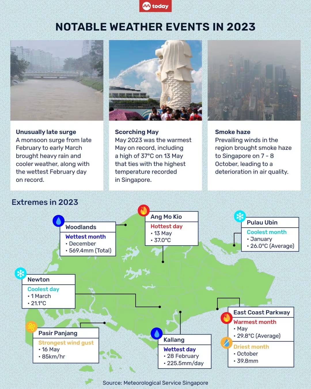 Other than an unusually scorching May, two other notable weather events impacted Singapore last year - an uncommonly late monsoon surge from late February to early March, and hazy conditions in October.