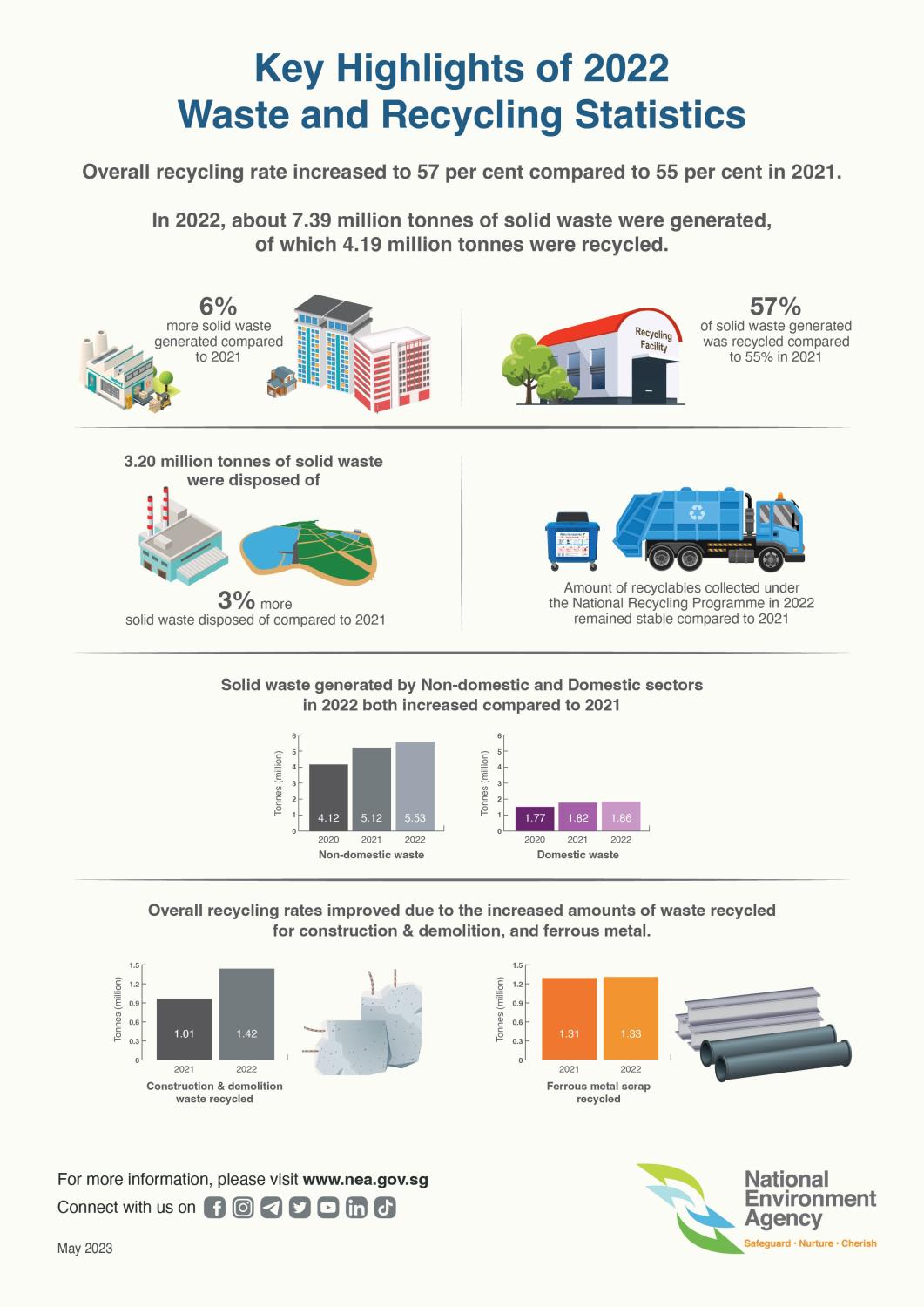 Around 7.39 million tonnes of solid waste were generated last year. This is an increase of about 6 per cent from the 6.94 million tonnes in 2021, according to the National Environment Agency’s (NEA) annual waste and recycling report released on Wednesday (May 3).