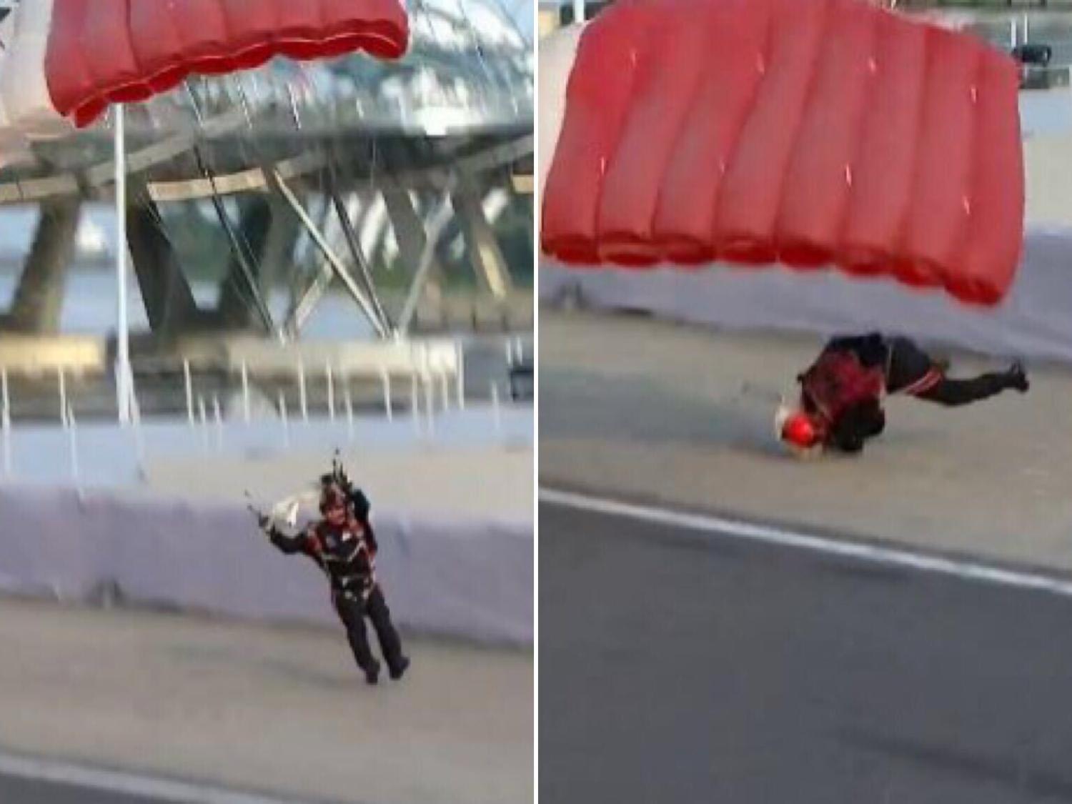 At the NDP on Aug 9 evening, 3WO Heng was the last of 10 parachutists to land at the Marina Bay floating platform when he skidded on the pavement and fell to the ground entangled in his parachute.