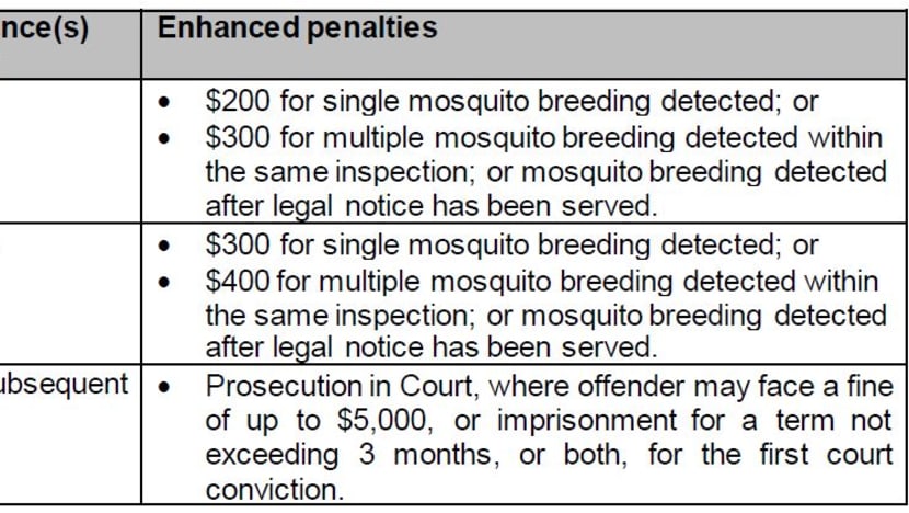 The tougher penalties are in addition to existing penalties against mosquito breeding found in common habitats, such as on rooftops, in water tanks and discarded receptacles, NEA said.