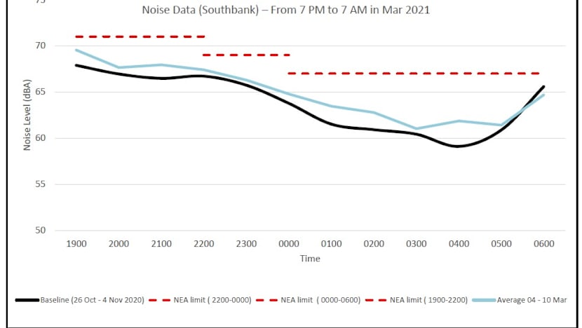 The charts for all three locations showed that the noise meter readings for both periods did not exceed the limits set by NEA.