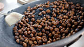 In the pot, chestnuts in their brown shells roll around gently in pitch-black coarse sand. The sand doesn’t start black, Uncle Black explains, the sugar added to the chestnuts while roasting gives it that colour.