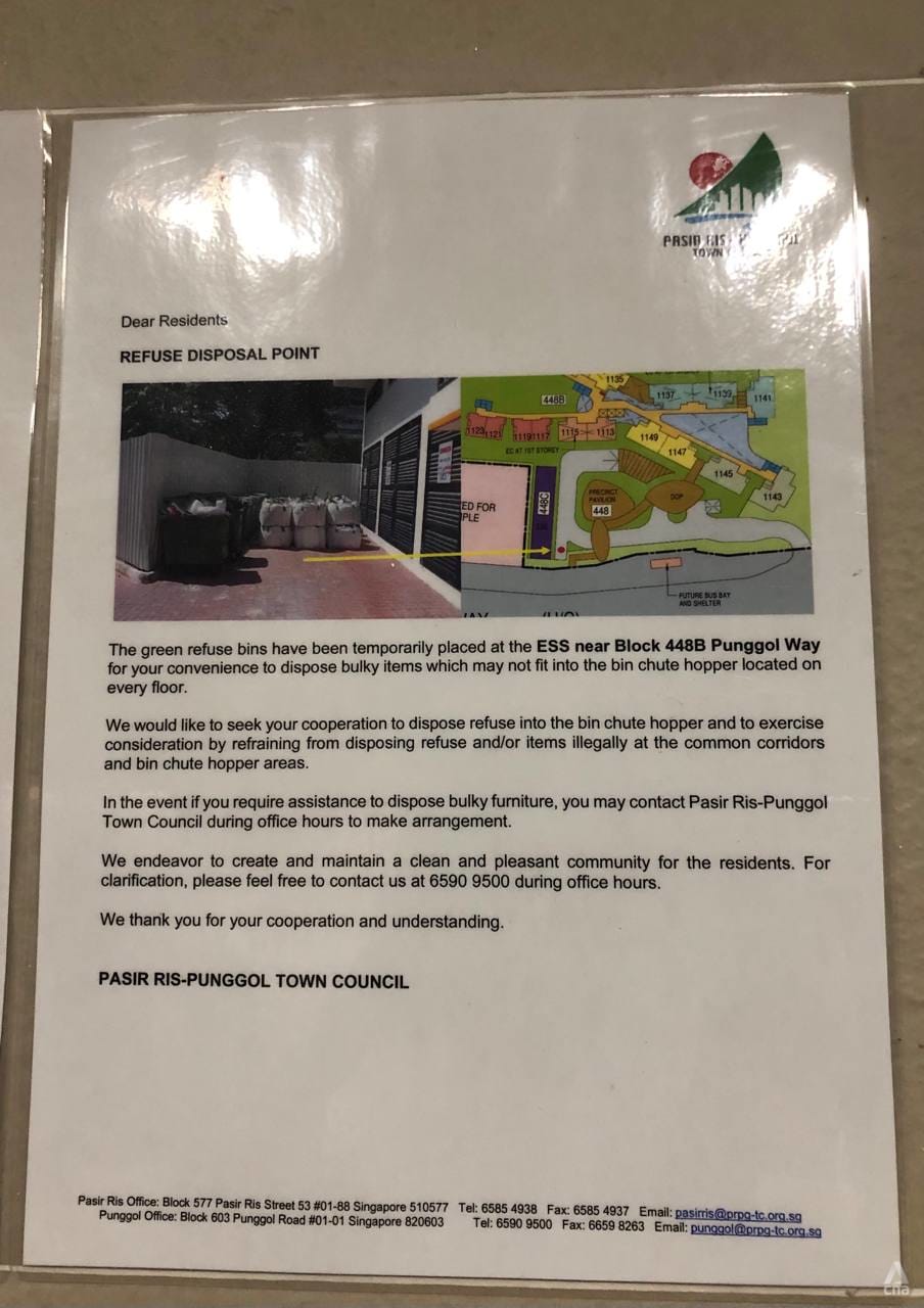 A notice from Pasir-Ris Punggol Town Council, which was plastered near the lifts, pointed to green refuse bins "temporarily" placed near the block entrance.