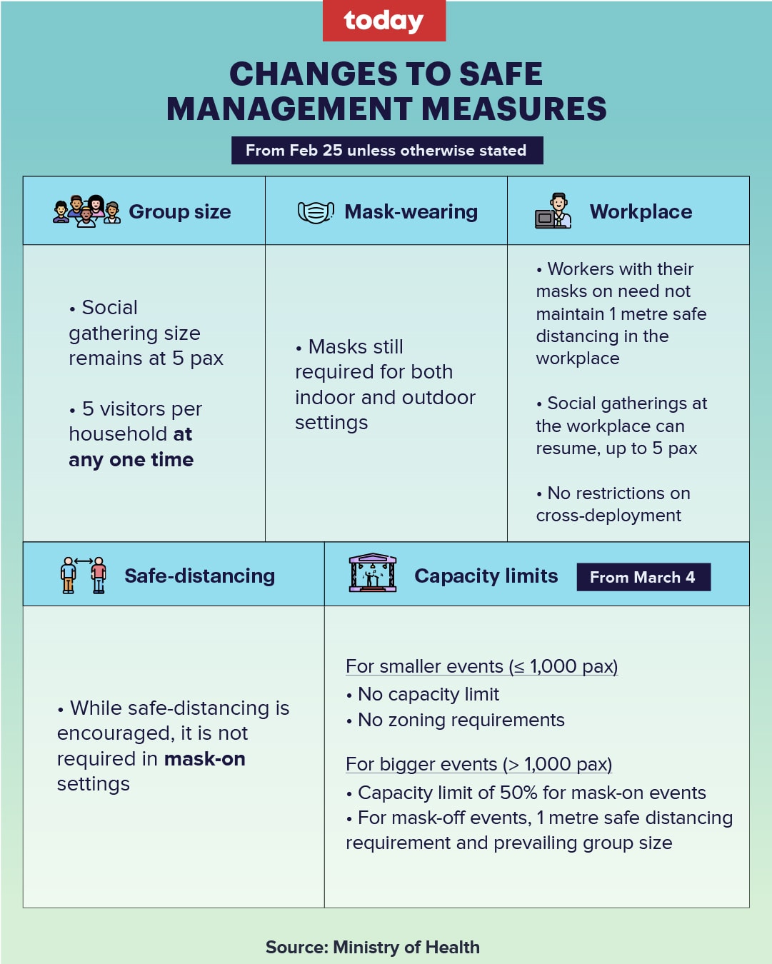 Safe distancing no longer required when masks are on from Feb 25; household visitors cap eased to 5 at any time