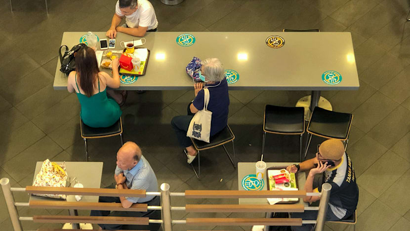 Safe distancing at food and beverage outlets at Tampines Mall on March 27, 2020. Raj Nadarajan/TODAY