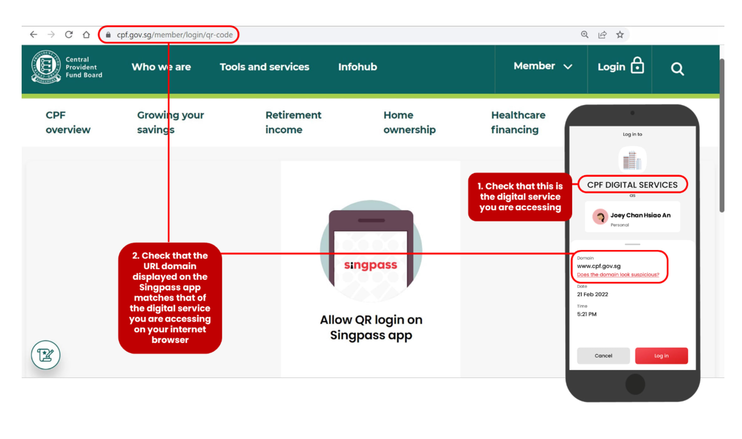 - Always checking the consent screen on their Singpass app to verify the legitimacy of the digital service they are accessing after scanning a Singpass QR code. Ensure that the domain URL or online address displayed on their Singpass app matches that in the website address bar of the browser. Otherwise, do not tap on the "Log In" button on the consent screen