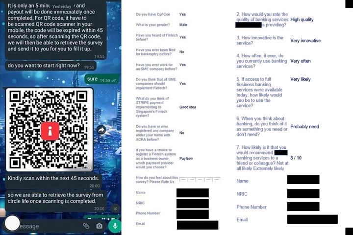 When victims have completed the surveys, the scammers would send them a screenshot of a Singpass QR code, telling them that they have to scan it to verify their identity in order to receive the rewards.