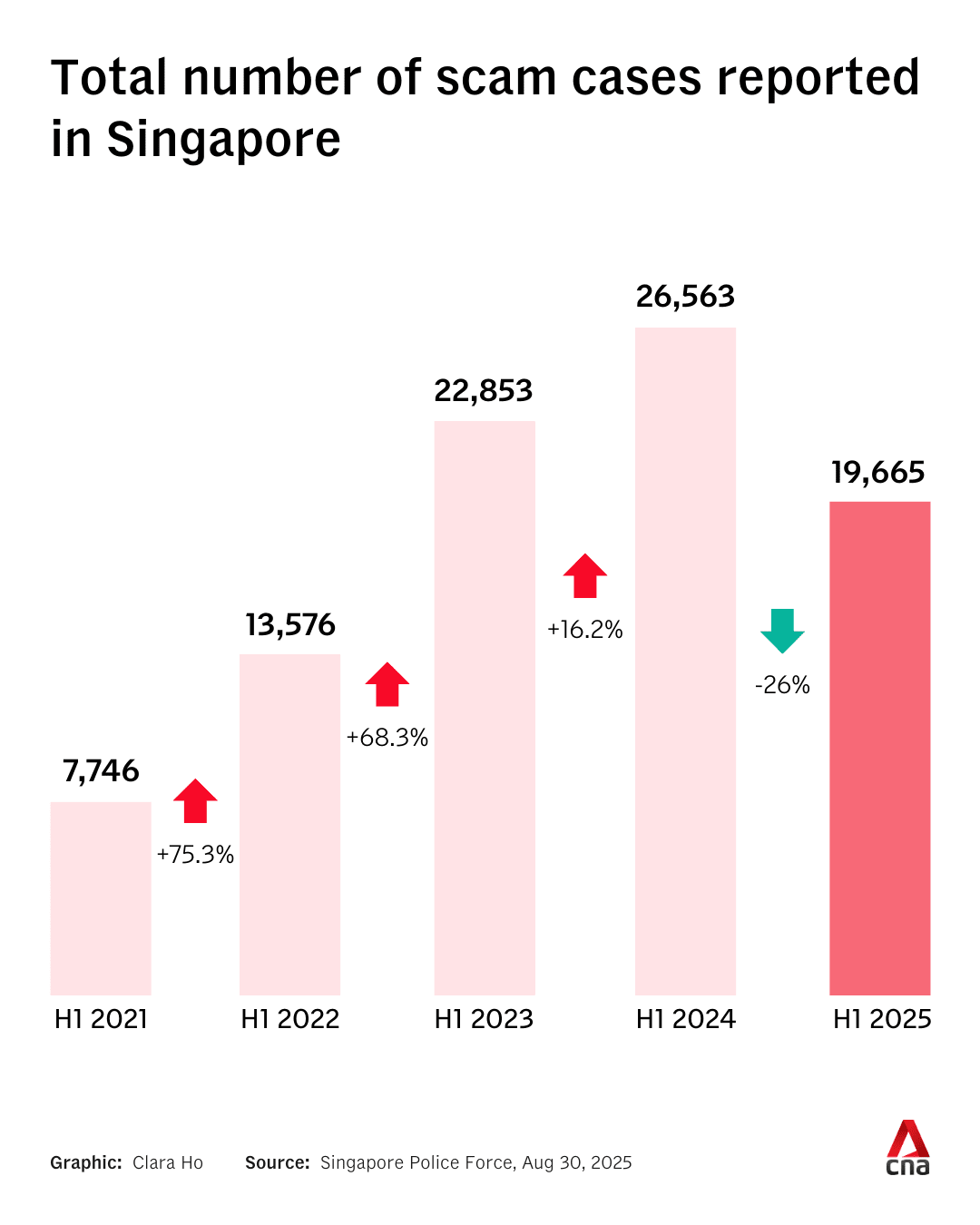 According to the mid-year figures released by the police on Saturday (Aug 30), there were 19,665 cases in the first half of 2025 - a 26 per cent drop from the 26,563 cases in the same period last year.