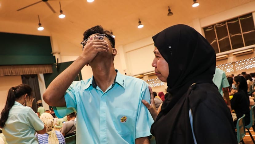 Harivaran Paul Kumar, from Pei Hwa Secondary School, reacts as he received news of his N-Level results on Dec 18, 2023.