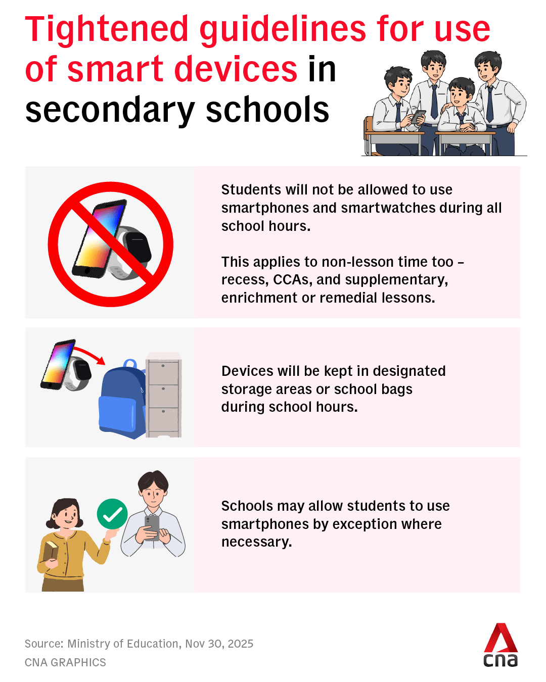 SINGAPORE: From 2026, secondary school students will not be allowed to use smartphones or smartwatches during school hours, including outside of lesson time.