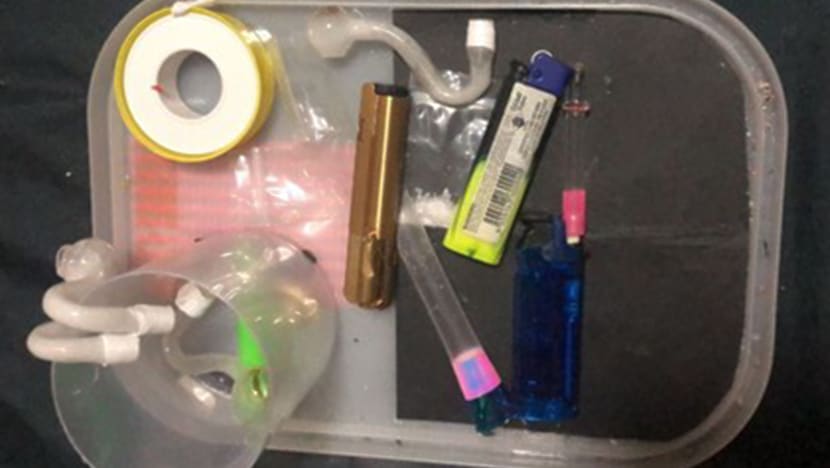 The haul? Five packets containing about 2.4g of crystalline substances — believed to be Ice — as well as drug-taking utensils.