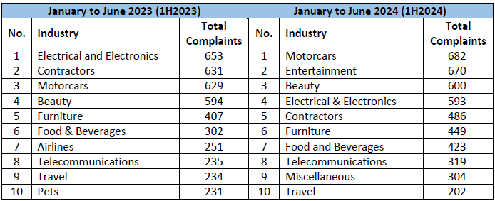 The motorcars industry saw the most complaints in the first half of this year, mainly due to issues with car sharing, rental and second-hand vehicles.