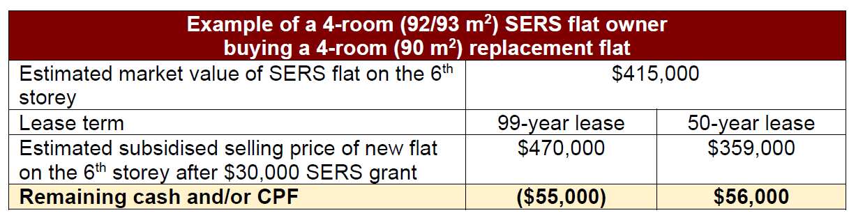 The estimated subsidised selling price of a 90 sq m replacement flat that is also on the sixth floor - after factoring in a S$30,000 SERS grant - is S$470,000 for a unit that is on a 99-year lease. It is S$359,000 for a unit on a 50-year-lease.