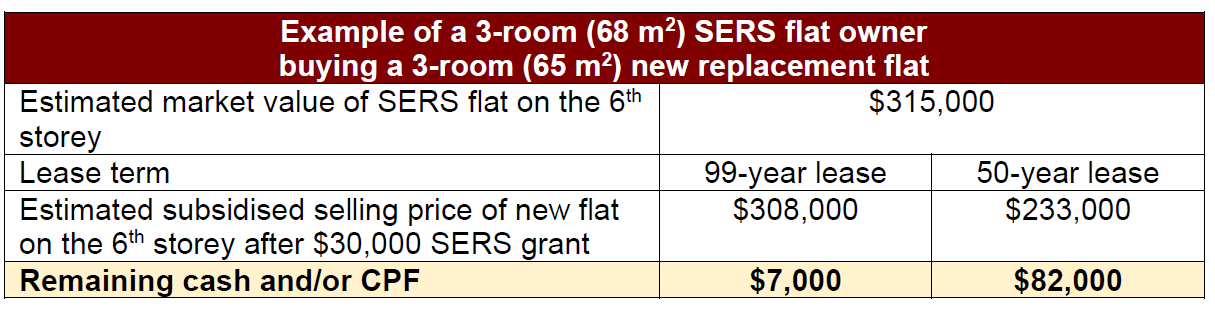SERS home owners can choose to buy a three-room or larger new flat at the designated SERS replacement site on a 50-year lease - if the 50-year lease flat is able to last them until at least age 95.