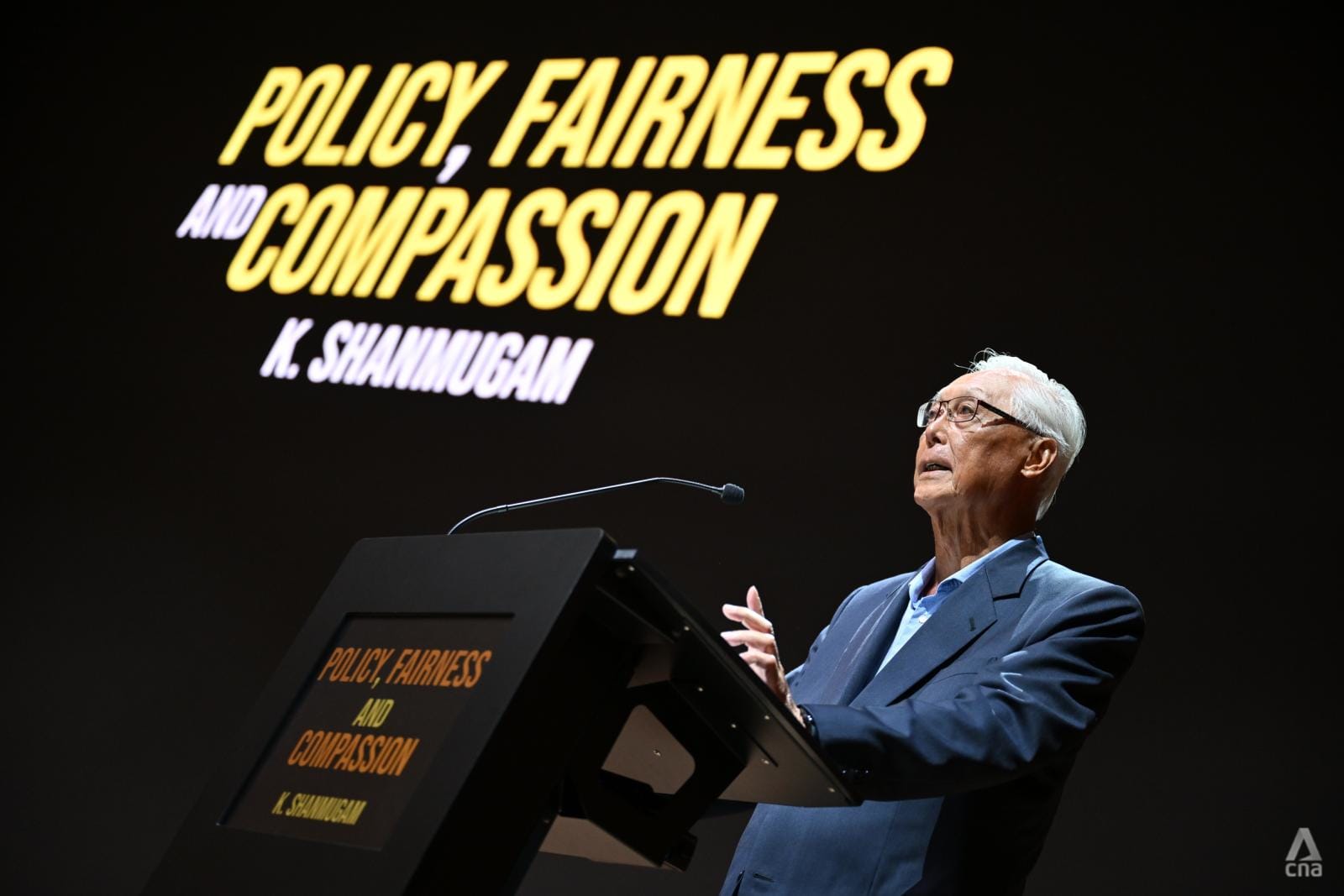 Coordinating Minister for National Security and Home Affairs Minister K Shanmugam in a discussion during the launch of his new book Policy, Fairness & Compassion at SPH Media Auditorium on Feb 6, 2026. (Photo: CNA/Jeremy Long)