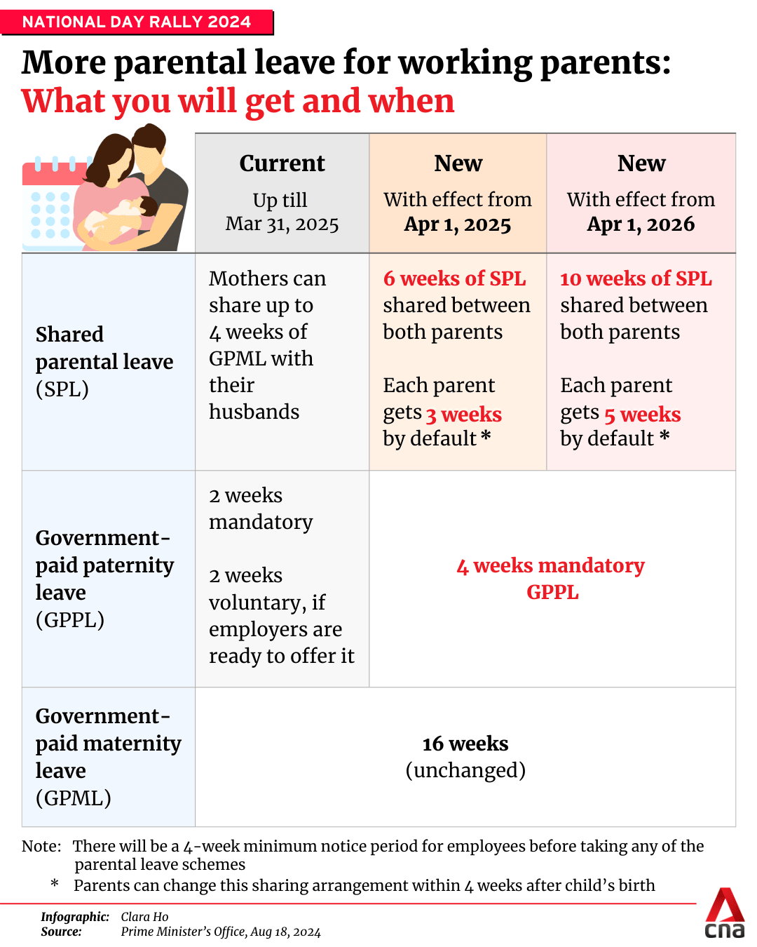SINGAPORE: A new shared parental leave scheme will give parents in Singapore 10 additional weeks of paid leave when fully implemented on Apr 1, 2026.