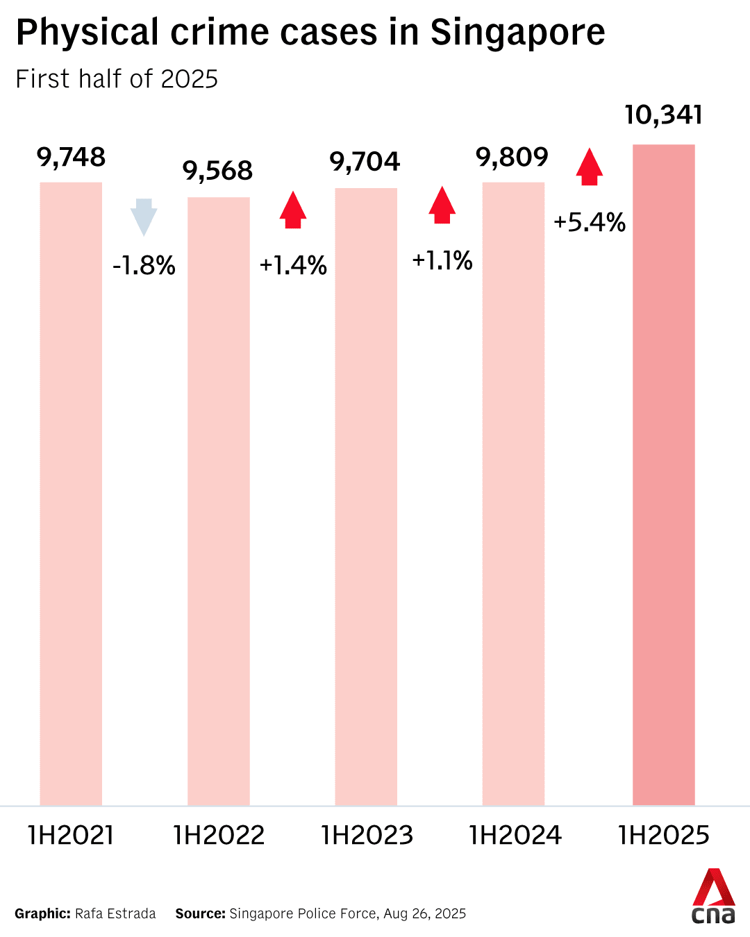 The overall number of physical crime cases similarly increased by 5.4 per cent to 10,341 in the first half of 2025, up from 9,809, according to mid-year statistics released by the Singapore Police Force (SPF).