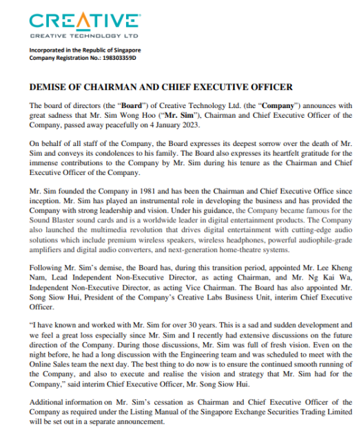 It added that the company also launched the multimedia revolution that drives digital entertainment with "cutting-edge audio solutions" and Sim played an "instrumental role in developing the business and has provided the company with strong leadership and vision".