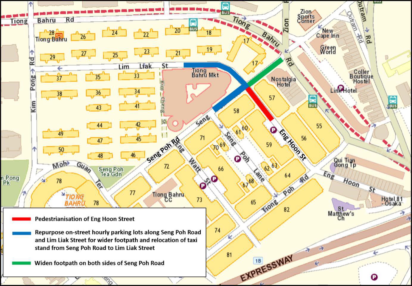 LTA will launch a six-month trial from the end of March to repurpose several roads in Tiong Bahru – Seng Poh Road, Eng Hoon Street and Lim Liak Street. This will be supported by "traffic calming measures" to slow down traffic and facilitate safer crossings.