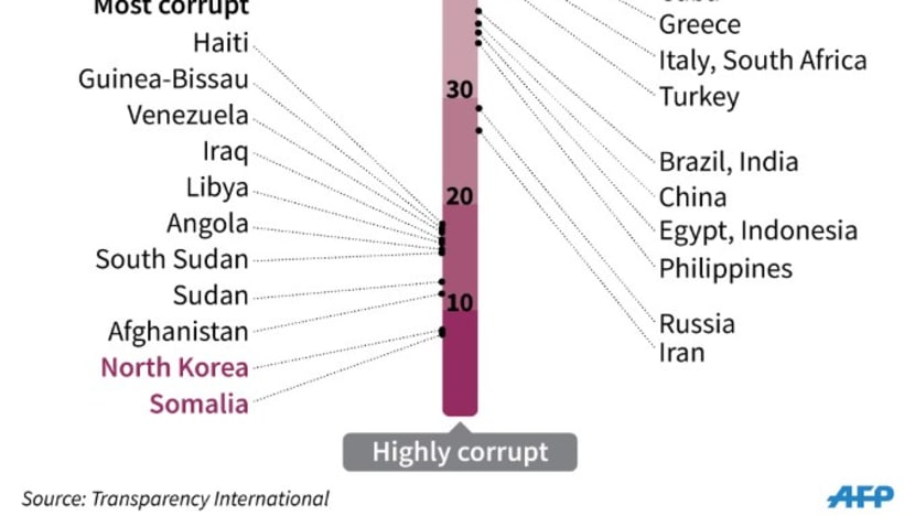 Transparency International’s index is based on expert opinions of public sector corruption and ranks countries on a scale from 0 (perceived to be highly corrupt) to 100 (perceived to be very clean). Denmark, Finland and Sweden were the three least corrupt countries in the world, according to the index, with Afghanistan, North Korea and Somalia at the very bottom.