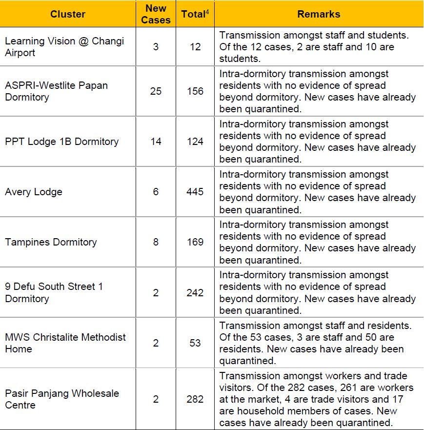The remaining two clusters that the ministry is monitoring are at MWS Christalite Methodist Home and Pasir Panjang Wholesale Centre, with 53 and 282 cases respectively.