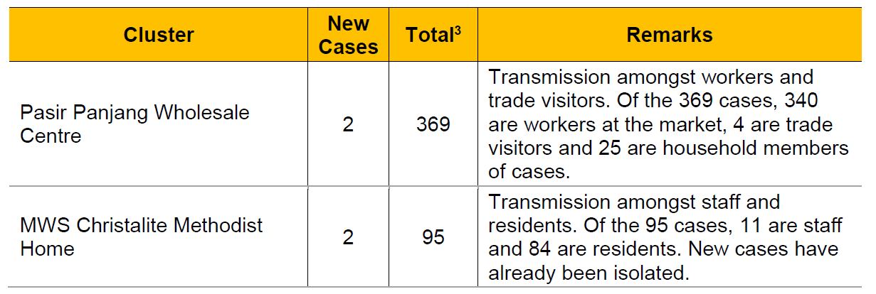 MOH said it is "closely monitoring" two active clusters, Pasir Panjang Wholesale Centre and MWS Christalite Methodist Home. They added two new cases each on Wednesday.