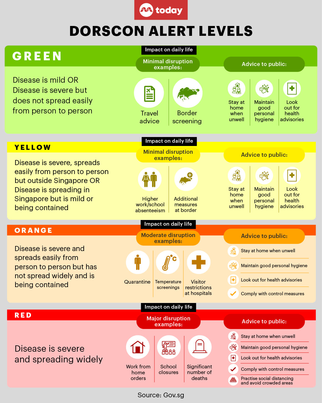 On the Gov.sg website, it is stated that Dorscon provides Singapore with general guidelines on what it needs to do to prevent and reduce the impact of infections, taking into account four key things: